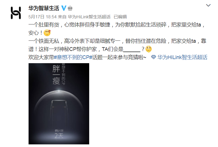 日前,@華為智慧生活 官方微博正式官宣#意想不到的CP#,“一對神秘CP幫你護家,TA們會是___?”簡單的預熱文字中,“護家”、“靠譜”、“安心”等關鍵詞十分搶眼,吸引了不少網友前來競猜,場面十分火熱。